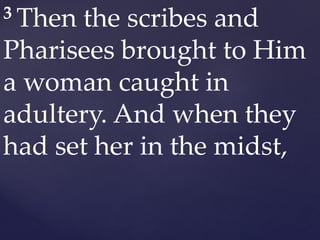 Then the scribes and Pharisees brought to Him a woman caught in adultery. And when they had set her in the midst they said to Him Teacher this woman was caught in adultery in the very act. 3 Then the scribes and Pharisees brought to Him a woman caught in adultery.